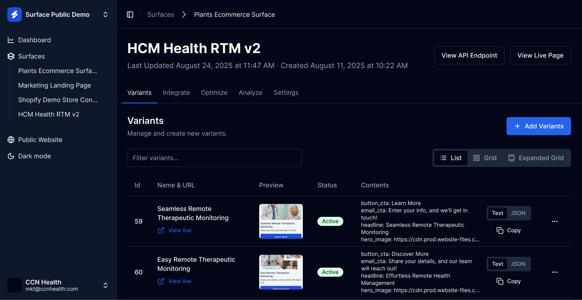 Surface AI is built around a core frustration shared by growth teams everywhere: by the time a test gets scoped, designed, built, and QA'd, the moment has passed. Surface AI removes that bottleneck with AI-led variant creation: you describe what you want to test, and the platform generates variations automatically.